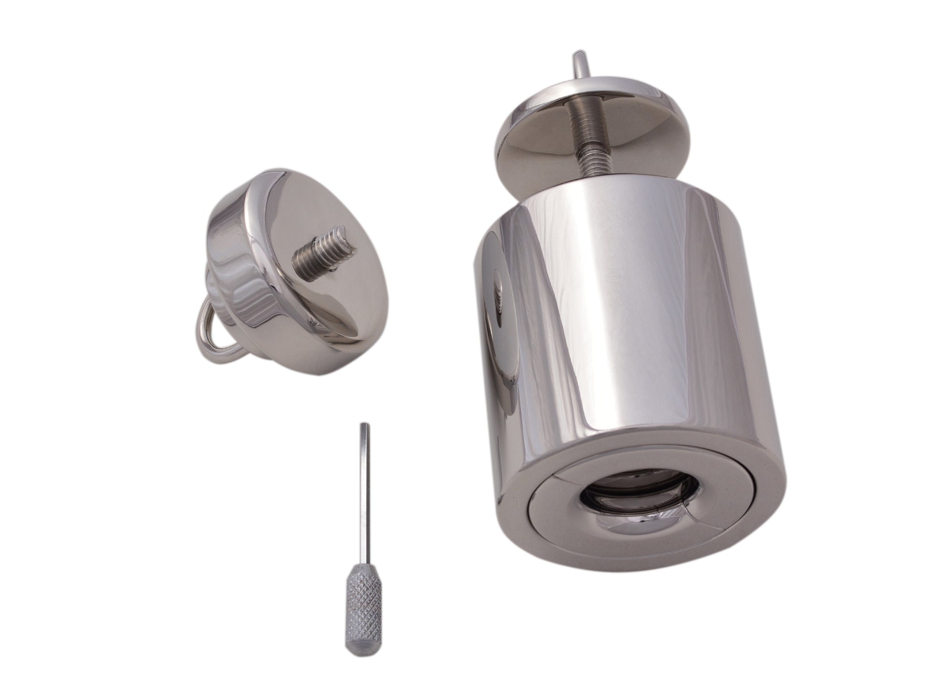 The ball flask fully encases the testicles inside a smooth, polished steel chamber, keeping them isolated and immobilized. Once secured, the crusher mechanism allows gradual, controlled tightening with each turn of the screw—ranging from a mild squeeze to intense CBT pressure. This dual design makes it one of the most versatile and extreme CBT toys in the market.