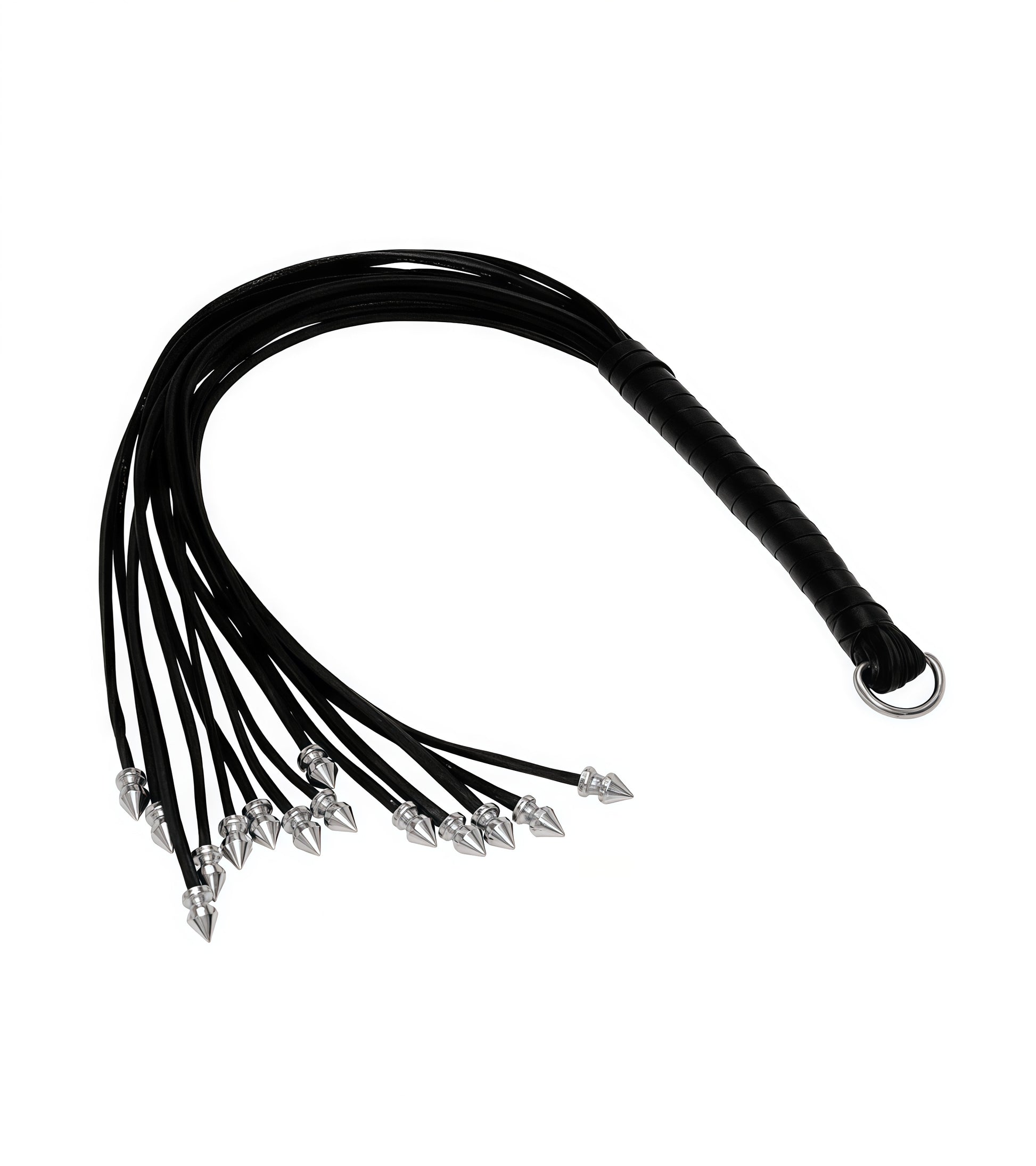 This black leather flogger with spiked ends is crafted for extreme sensation seekers who crave sharp, unforgettable impact. Each leather tail is finished with metal spike detailing, transforming every swing into a mix of sting and shock. It’s built for experienced users who know how to wield intensity with care.