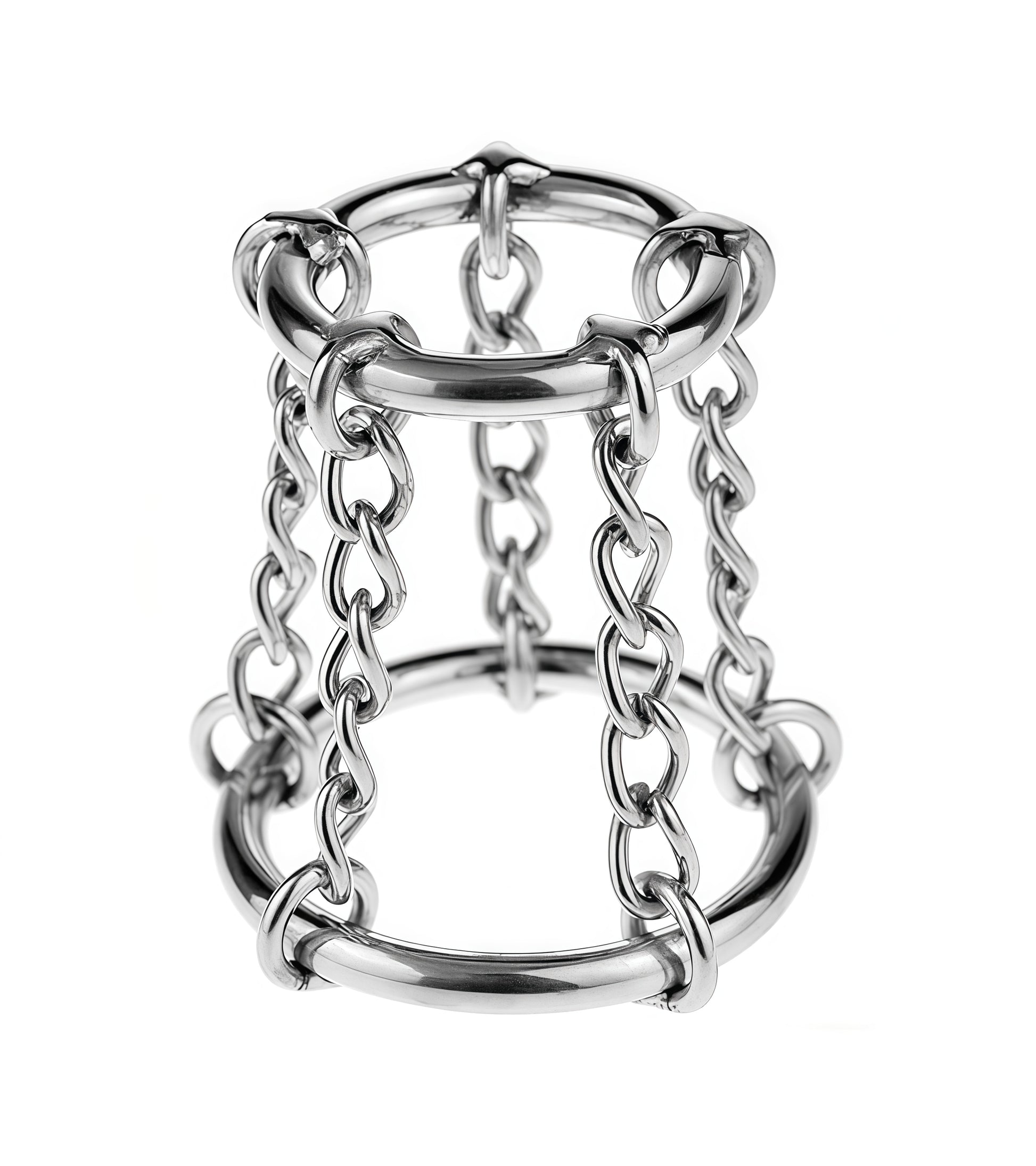 Made from high-quality stainless steel, the ring and cage structure is connected with strong interlocking chains that wrap securely around the shaft. This design offers a snug fit for erection control, while the open chain construction allows for airflow, comfort, and a visually striking look during play.