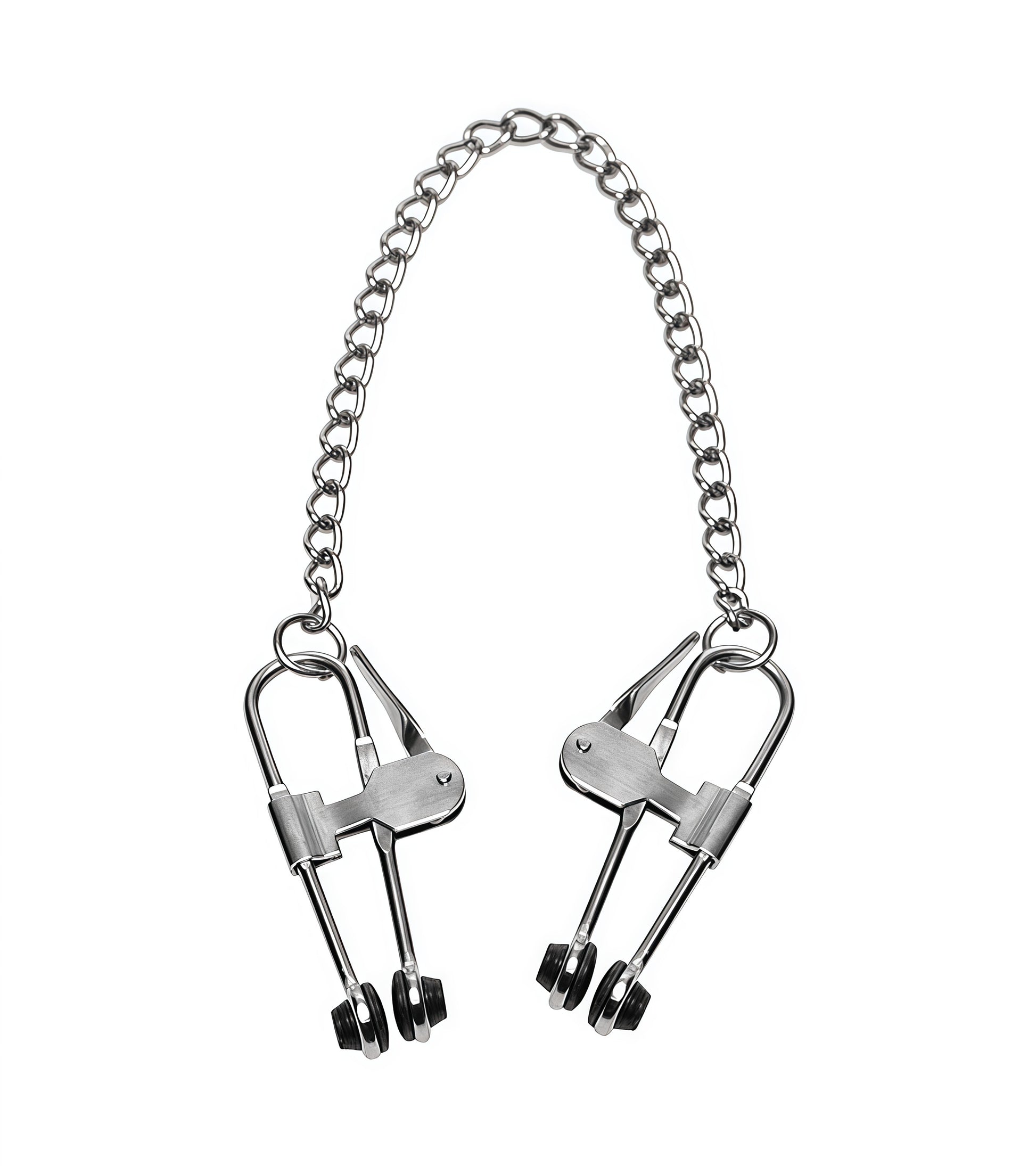 Engineered for intense nipple play, the Pressure Titlock with Chain delivers focused stimulation with a brutal edge. Each clamp features an adjustable pressure mechanism that locks firmly in place, giving users total control over the intensity. The connecting chain adds a visual and functional element—ideal for tugging, tension play, or attaching weights and leads.